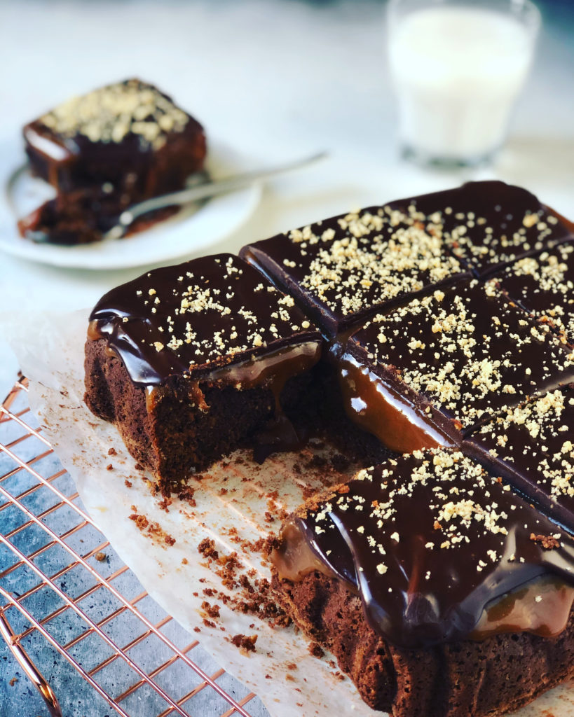 -Lasciare raffreddare e quando è ancora fluido versarlo sulla torta brownie e lasciare raffreddare in frigo