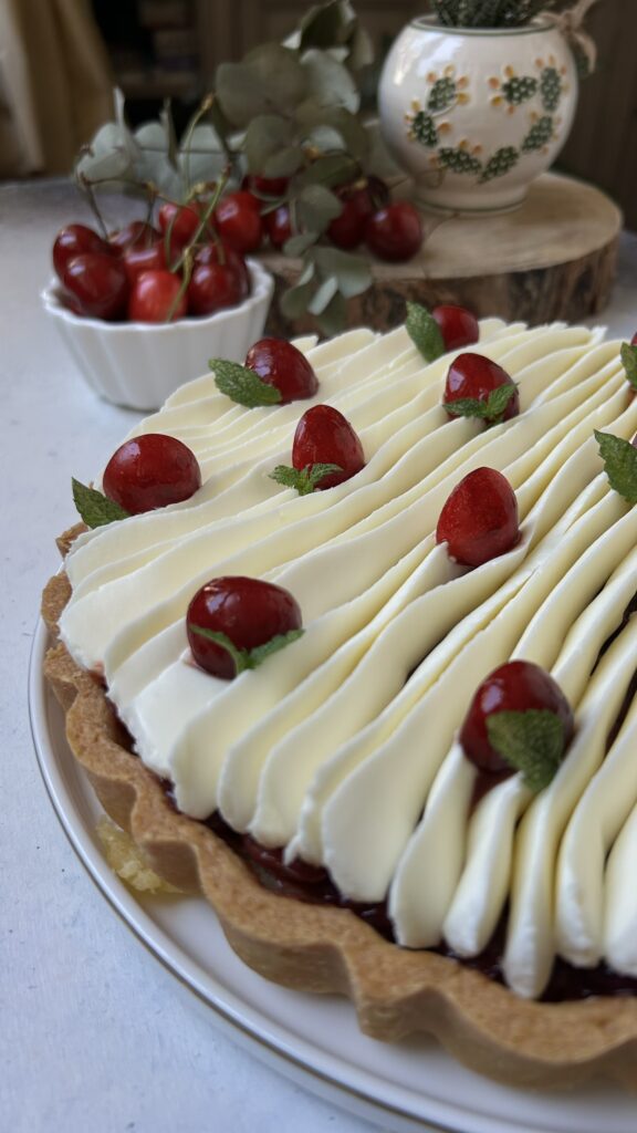 -Decorate la crostata come in foto, posizionate le ciliegie per decoro e completate con foglioline di menta