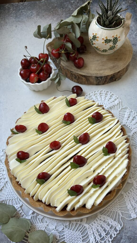 La crostata frangipane e ciliegie nasce per festeggiare un compleanno, quindi non la solita torta, ma qualcosa di fresco e goloso. Se come me, adorate le ciliegie ogni occasione è buona per inserirle in tutti i dolci di questo periodo. La frolla croccante ben si lega alla crema frangipane, quanto di più buono ci sia, incontra poi la morbidezza della composta di ciliegie e infine il cremoso al cioccolato bianco, la namelaka, fresco e delicato che unisce tutte le consistenze per avvolgere il palato in un morbido e goloso boccone.
