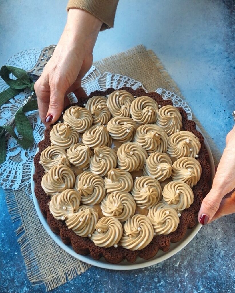 -Mettere la crostata sul piatto di portata, versare la crema di biscotto e decorare con il cremoso al cioccolato bianco e caffè